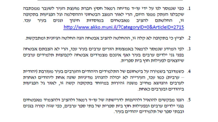במכתב נכתב בין היתר כי "לא הצבתם אבטחה בפני גני ילדים ערבים בעיר ואף אינכם מצמידים אבטחה לקבוצות תלמידים ערבים שיוצאים לפעילות חוץ בית ספרית".