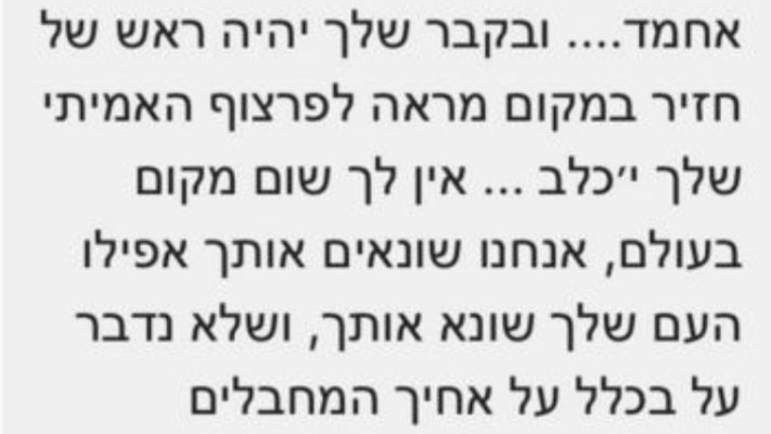 בהודעה ששלח החשוד לחבר הכנסת טיבי נכתב: "בקרוב מאוד אני זה שירצח את אחמד ובקבר שלך יהיה ראש של חזיר". החשוד המשיך ואיים: "הזמן שלך קצר, תהנה ממנו כמה שאתה יכול".