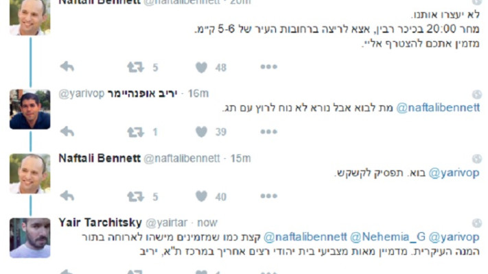התגובה של שר החינוך נפתלי בנט הפתיעה רבים מהגולשים ברשת, שנתקלו בפוסט שלו בפייסבוק ובטוויטר, שבו נכתב: "לא יעצרו אותנו. מחר, יום ראשון, 20:00 בכיכר רבין, אצא לריצה ברחובות העיר של 5-6 ק"מ. מזמין אתכם להצטרף אליי".