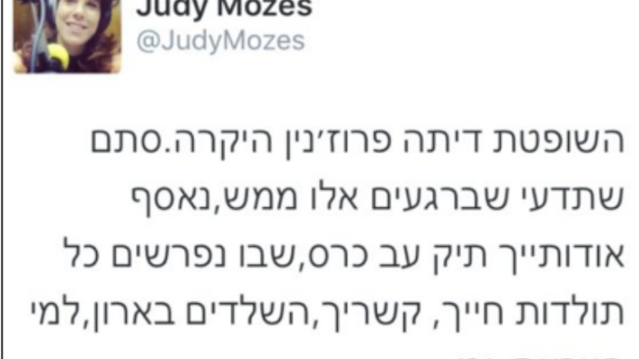 ג'ודי ניר מוזס לשופטת בפרשת מני נפתלי: "מכינים עלייך תיק"אשת התקשורת שוב מעוררת סערה: בציוץ שהעלתה בו התייחסה לפרשת אב הבית לשעבר בבית רה"מ, היא פנתה לשופטת דיתה פרוז'נין: "נאסף אודותייך תיק עבה כרס, עם כל תולדות חייך"מעריב אונליין11:19 11/02/2016ג'ודי שלום ניר מוזס | צילום: רפי דלויה2גלריה תגיות:שרה נתניהו/ מני נפתלי/ גודי ניר מוזס שלום