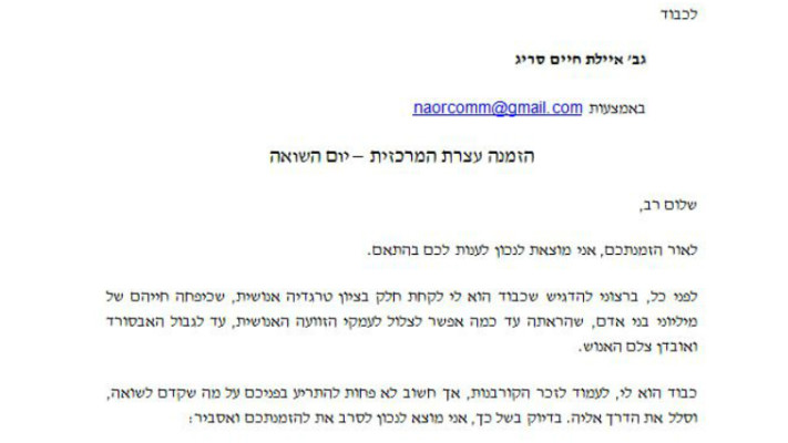 ח"כ זועבי הוזמנה לטקס ביחד עם אישי ציבור נוספים, אך סירבה בשולחה מכתב מנומק. היא הסבירה כי לכבוד הוא לה לקחת חלק בציון טרגדיה אנושית שקיפחה חייהם של מיליוני בני אדם ולעמוד לזכר הקורבנות, אולם לטענתה "חשוב לא פחות להתריע בפניכם על מה שקדם לשואה וסלל את הדרך אליה".