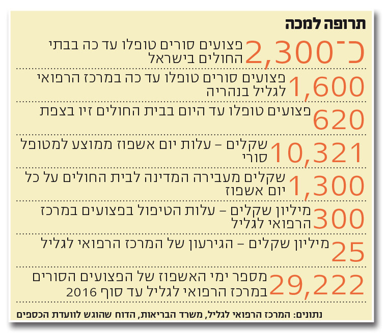 על פי נתוני המרכז הרפואי לגליל בנהריה, בארבע השנים שחלפו נקלטו שם כ־1,600 פצועים סורים, "שמרביתם סובלים מפגיעות טראומה מורכבות: ראש וחזה, בטן וגפיים, פגיעות כירורגיות, אורתופדיות ופלסטיות וכו'". עלות יום אשפוז ממוצע למטופל סורי נאמדת ב־10,321 שקלים. על פי הדוח שהציג ח”כ ברושי בדיון בוועדת הכספים, המדינה – באמצעות צה"ל - מעבירה לבתי החולים רק 1,300 שקלים על כל יום אשפוז.
