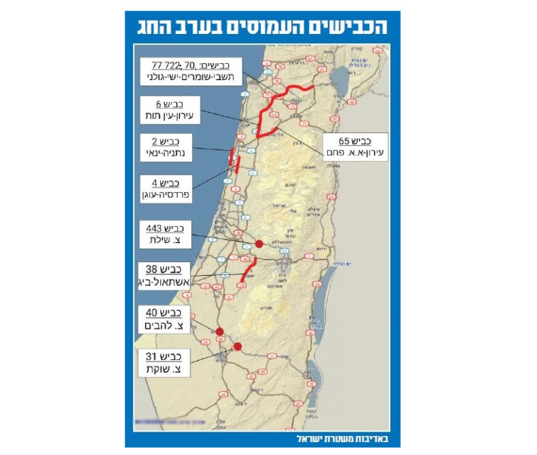 בהתאם לניסיון העבר ערכו במשטרת התנועה מיפוי של צירי התנועה שצפויים להיות עמוסים הערב. מדובר בכבישים 70, 722 ו־77 בגליל, בכביש 6 בקטע בין עירון לעין תות, בכביש 2 בקטע שבין נתניה למחלף ינאי, בכביש 4 בקטע שבין פרדסיה לעוגן, בכביש 443 באזור צומת שילת במודיעין, בכביש 38 באזור אשתאול, וכן בצמתים להבים ושוקת בדרום.