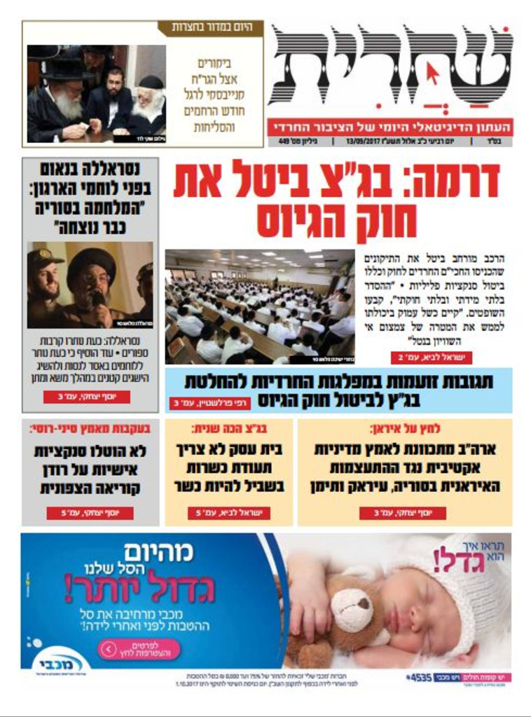 מעל הכותרת הראשית מבטיח העיתון לקוראיו כי "כאשר יענו אותו כן ירבה וכן יפרוץ – היהדות החרדית מלוכדת נגד החלטת בג"ץ". סגן השר מאיר פרוש מצוטט בעמוד הראשון כמי שאומר "האקטיביזם השיפוטי של בג"ץ מרוקן כליל את חשיבות החקיקה בכנסת. בג"ץ להוט למלחמה".