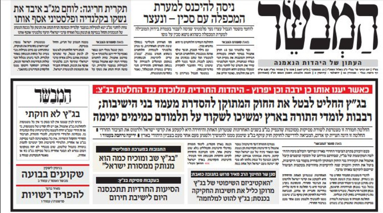 העיתון מדווח על "התפכחות מקיפה בציבור החרדי בעקבות החלטת בג"צ. עולם התורה מתלכד סביב המסקנה הבלתי נמנעת: מאבק עיקש ואי התייצבות בלשכות הגיוס כהוראת רבנו מר"ן ראש הישיבה שליט"א. לעומתו כותב "המבשר", עיתון חרדי יומי המזוהה עם סיעת שלומי אמוני ישראל באגודת ישראל וח”כ מאיר פרוש, כי "בג"צ החליט לבטל את החוק המתוקן להסדרת מעמד בני הישיבות. רבבות לומדי התורה בארץ ימשיכו לשקוד על תלמודם כמימים ימימה".