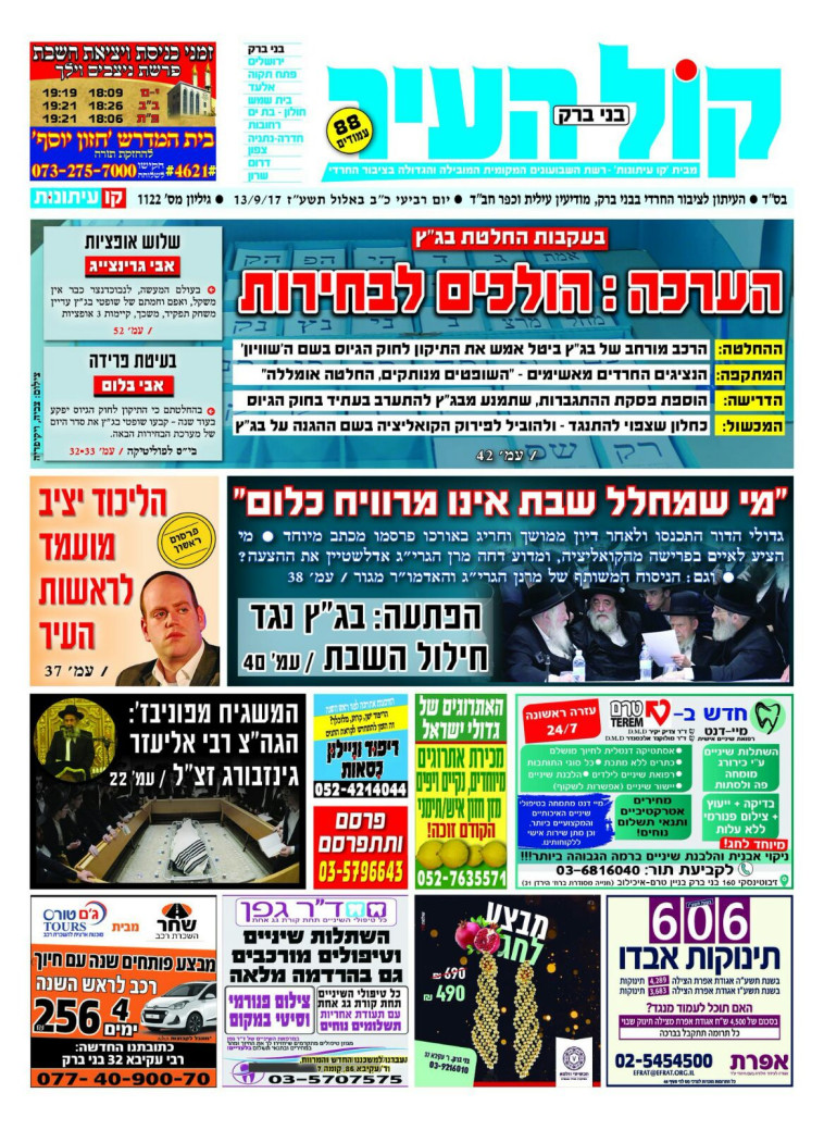 את הכותרת המלחמתית ביותר ניפק "השבוע", מקומון המופיע בבני ברק ובביתר עילית שכתב: “בעקבות החלטת בג"ץ. הערכה – הולכים לבחירות". הדרישה: הוספת פסקת התגברות שתמנע מבג"ץ להתערב בעתיד בחוק הגיוס. המכשול: כחלון שצפוי להתנגד ולהוביל לפירוק הקואליציה בשם ההגנה על בג"ץ".