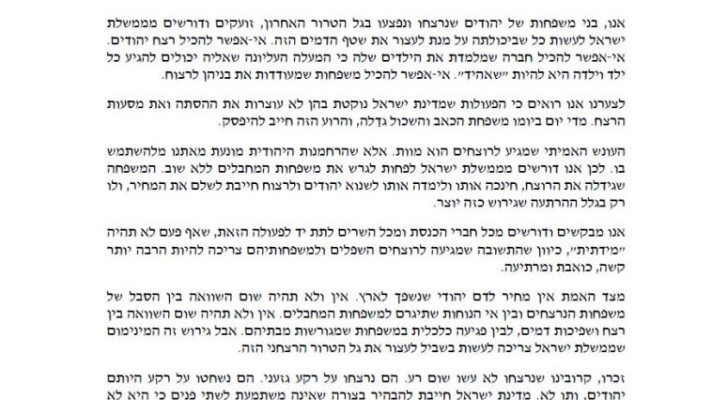 "זכרו, קרובינו שנרצחו לא עשו שום רע. הם נרצחו על רקע גזעני. הם נשחטו על רקע היותם יהודים, ותו לא. מדינת ישראל חייבת להבהיר בצורה שאינה משתמעת לשתי פנים כי היא לא תסבול בשום אופן רצח של יהודים, ולכן היא תעשה כל דבר בשביל לסכל את הרצחנות הזאת. ואם כרגע אין אפשרות לעשות באמת 'כל דבר' – גירוש המשפחות ופגיעה כלכלית זה המינימום", חותמים את המכתב בני המשפחות.
