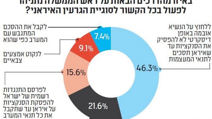 על רקע זה, רוב גדול (70%) של הנשאלים סבור כי על ראש הממשלה בנימין נתניהו לדחות את ההסכם כפי שהוא מסתמן כעת. כשנשאלו כיצד צריך נתניהו לפעול בנושא, ענו 46% כי עליו ללחוץ על הנשיא אובמה באופן דיסקרטי. 16% אמרו כי עליו לפרסם התנגדות רשמית וגלויה, ו־9% בלבד סבורים כי על ישראל לנקוט אמצעים צבאיים. רק כ־7% מהנשאלים אמרו שעל ישראל לקבל את ההסכם כפי שהוא.