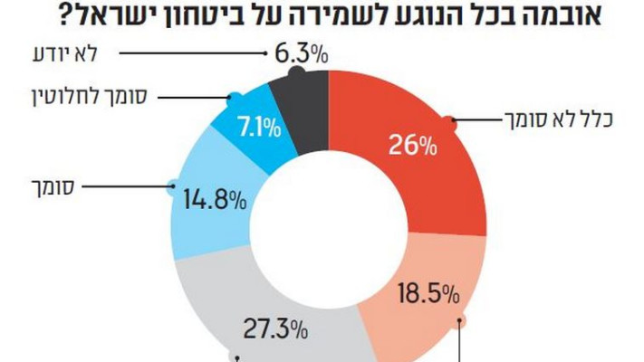 ראש הממשלה אכן התייחס אתמול פומבית לשיחות הגרעין, כשנאם בטקס סיום קורס טיס בחצרים. ״ככלל שמתקרב המועד שנקבע בין המעצמות לאיראן להשגת היעדים, הולכים וגדלים הוויתורים לאיראן״, אמר נתניהו והוסיף, ״ההסכם הזה פגום מיסודו, הוא מותיר בידי איראן נתיב להשגת ארסנל של פצצות גרעין תוך עשור. עדיף שום הסכם מהסכם רע. ובכל מקרה, יהיה אשר יהיה, ישראל לעולם תגן על עצמה, ובזה - חלקו של חיל האוויר רב״. הסקר מלמד עוד כי המתח וחוסר האמון בין ישראל לארה״ב אינו מסתכם ביחסים בין מנהיגי המדינות, והוא מחלחל גם לציבור הרחב. רק כחמישית מן הנשאלים (22%) ציינו כי הם סומכים על ממשל אובמה בכל הנוגע לשמירה על ביטחון ישראל. כ־45% אמרו כי הם ״לא סומכים״ או ״לא סומכים כלל״ על האמריקאים.