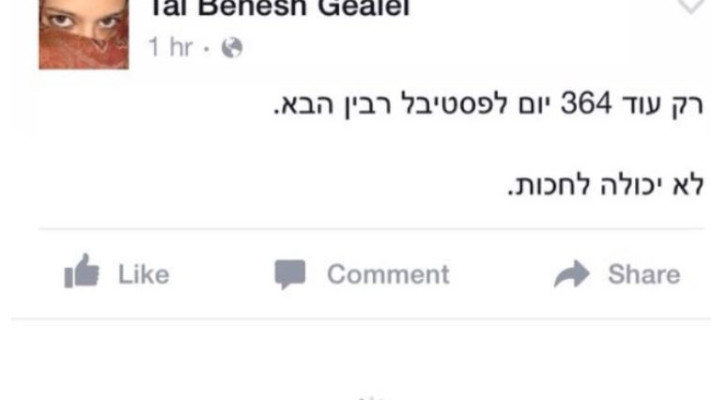 הדוברת פרסמה היום (שלישי) בחשבון הפייסבוק שלה את הפוסט הבא: "רק עוד 364 יום לפסטיבל רבין הבא. לא יכולה לחכות".