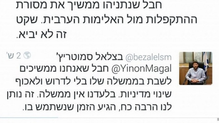 לאחר שתקף מגל את נתניהו, ח"כ בצלאל סמוטריץ' יצא נגד הממשלה וכתב: "חבל שאנחנו ממשיכים לשבת בממשלה שלו בלי לדרוש ולאכוף שינוי מדיניות. בלעדינו אין ממשלה. זה נותן לנו הרבה כוח, הגיע הזמן שנשתמש בו". מגל הגיב לדברי סמוטריץ' והביע את הסכמתו: "זה דבר חמור בהחלט שיעלה מחר בישיבת הסיעה.