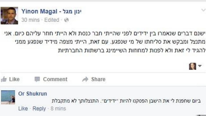 שוקרון הגיבה לתגובה שפרסם מגל בפייסבוק בעקבות הפוסט של רוטנר וכתבה לו: "ביום שחפנת לי את הישבן הפסקנו להיות 'ידידים'. התנצלותך לא מתקבלת".