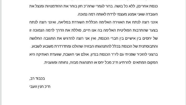 בתלונתה אומרת עוד ח"כ זועבי כי היא אינה רוצה לנתח את האווירה האלימה הכללית השוררת במליאה או לנתח את התרבות הפוליטית האלימה השוררת כיום במדינה, הסוללת את הדרך ל"רמה נמוכה כל כך של יחסים בין אישיים בכנסת". היא מציינת כי התלוננה על התבטאויותיו של ח"כ חזן בפני יו"ר הכנסת יולי אדלשטיין אך לדבריה ועדת האתיקה היא המקום הנכון להרתיע חברי כנסת מלגלות יחס או התנהגות מבזה, כפי שלדבריה נוקט ח"כ חזן כלפיה.