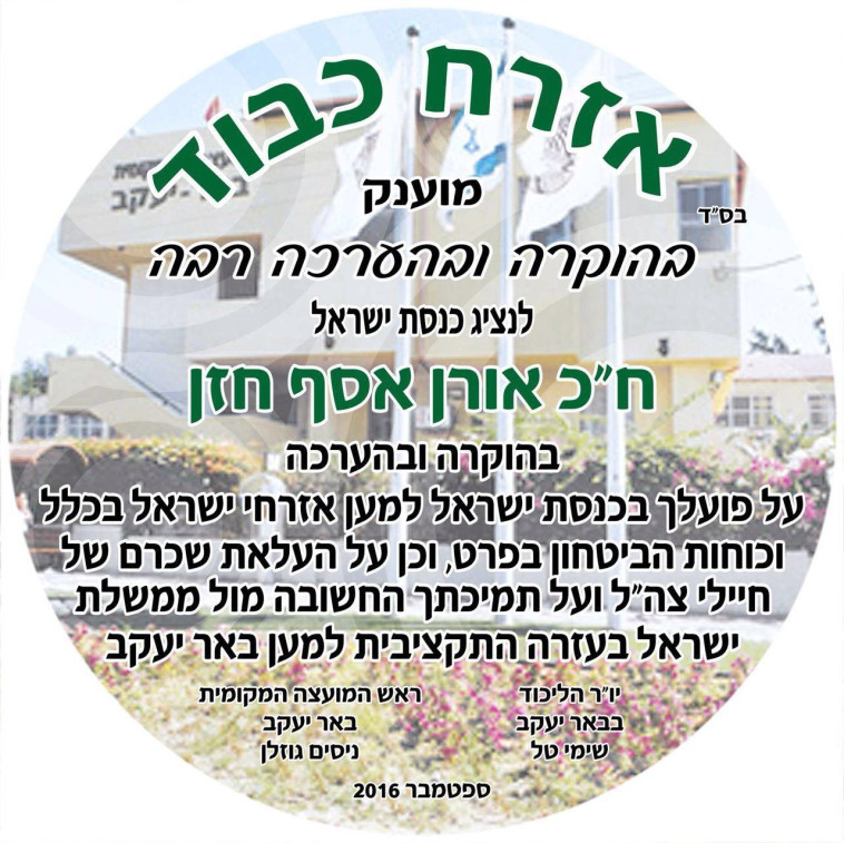יו"ר סניף הליכוד המקומי, שימי טל, העומד מאחורי היוזמה, הסביר: "זו תעודת אזרחות כבוד שאני וראש המועצה מעניקים כבר כמה שנים. בשנה שעברה הענקנו תעודה דומה לשר צחי הנגבי ולפני כשנתיים זכה בה יו"ר הכנסת יולי אדלשטיין".
