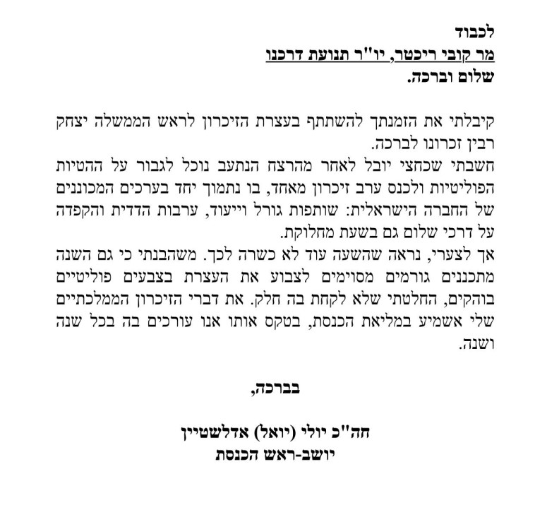 דרכנו תפעל לקיומה של עצרת ממלכתית לציון יום השנה לרצח רבין, אשר תזכיר את האחריות של כולנו לפעול למען פוליטיקה נקייה מהסתה ואלימות. אנחנו נחושים בדרכנו לגשר, לחבר ולהשמיע את הקול של הרוב המתון. לא חדלנו כאשר בשנה שחלפה זכינו לביקורת משמאל, ולא נחדל כעת כאשר יו"ר הכנסת מעדיף שיקולים פוליטיים, מעוות את כוונתנו ומשיב פנינו ריקם".