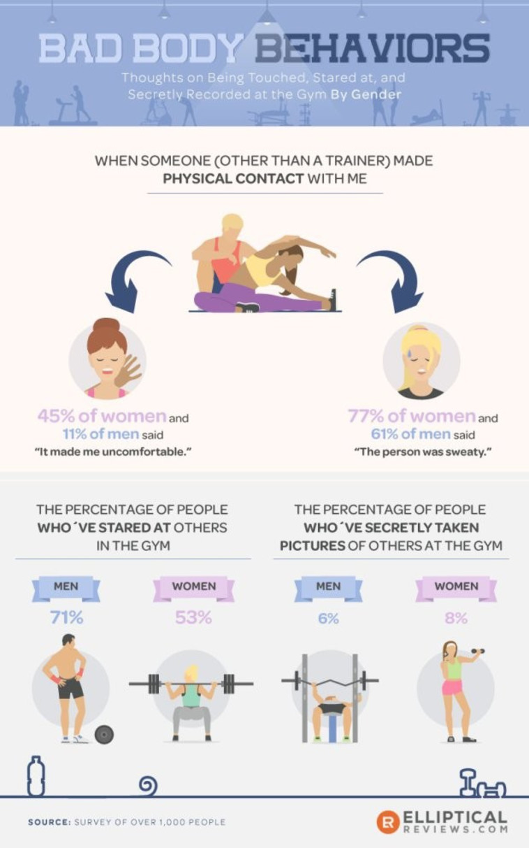 באופן לא מפתיע, יותר גברים (71%) מנשים (50%) הודו  שהם נטו יותר לבהות בבני המין השני בחדר הכושר. מבין אלו, מי ששתו שייק פרוטאין ולקחו תוספי מזון אחרים נמצאו כבעלי סיכוי גבוה פי שניים להתחיל עם מישהו בחדר הכושר מאלו שלא שותים אותם כלל.