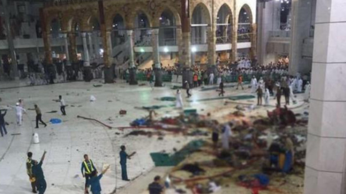 האסון הזה אירע 12 יום אחרי טרגדיה אחרת שפקדה את העיר הקדושה ביותר לאסלאם. עגורן ענק שניצב מחוץ לחומות המסגד הקדוש וסייע בעבודות פיתוח ובנייה, לא עמד בעוצמת הרוחות החמות שהשתוללו באותם ימים באזור. בעוד אלפים גודשים את רחבת המסגד, בראשיתם של טקסי החג’, התמוטט העגורן לתוך המתחם. 111 עולים לרגל נמחצו למוות. בדיעבד, התברר אסון העגורן כקדימון למוות ההמוני שציפה מעבר לפינה.