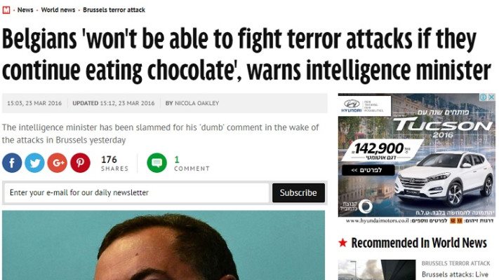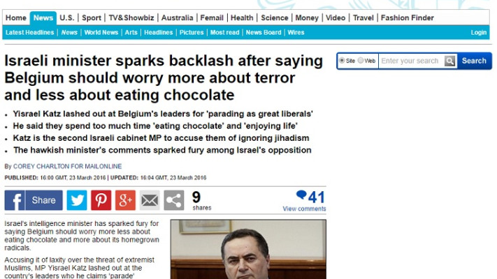 ישראל כץ הגיע לכותרות ברחבי העולם: "האשים את הבלגים 'אוהבי השוקולד' במתקפת הטרור"שר התחבורה והמודיעין כנראה לא שיער לעצמו שכך תופץ אמירתו, יום לאחר שנהרגו 31 בני אדם בבלגיה, לפיה "אם בבלגיה ימשיכו לאכול שוקולד - הם לא יוכלו להילחם בטרוריסטים"מעריב אונליין21:06 23/03/2016מעריב אונליין | צילום: מעריב אונליין5גלריה תגיות:ישראל כץ/ מתקפת טרור בבריסל