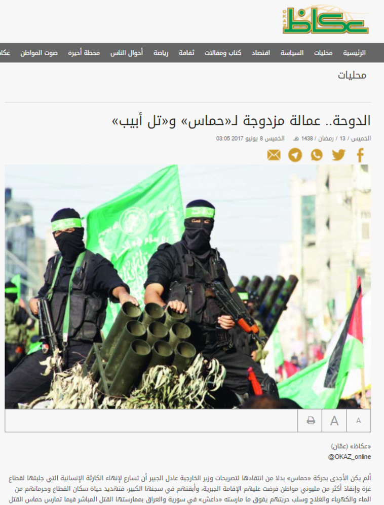 על פי העיתון, חמאס רצועת עזה לוקח מיליוני דולרים מסעודיה והאמירויות, במטרה לחפור מנהרות ומחזיק שני מיליוני פלסטינים ברצועה כבני ערובה. "על חמאס היה למהר לסיים את האסונות של רצועת עזה, במקום לצאת בביקורת נגד ההצהרות של שר החוץ הסעודי, עאדל ג'ובייר", שדרש מוקדם יותר מקטאר לנתק את יחסיה עם הארגון העזתי כמו גם עם האחים המוסלמים.