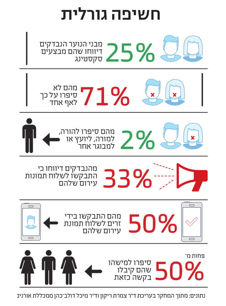 מממצאי מחקר חדש הבוחן את הרגלי הסקסטינג של מתבגרים בישראל עולה מסקנה אחת ברורה: מהחזית הזאת אי אפשר להתעלם. את המחקר ערכו ד"ר צמרת ריקון ומיכל דולב־כהן ממכללת אורנים בקרב 547 מתבגרים, תלמידי כיתות ז'-י"ב ברחבי הארץ (מתוכם 16% לומדים במסגרות חינוך דתיות). 25% מהנבדקים דיווחו שהם מבצעים סקסטינג. 71% מהם לא סיפרו על כך לאף אחד ו-2% מהם סיפרו להורה, למורה, ליועץ או למבוגר אחר.